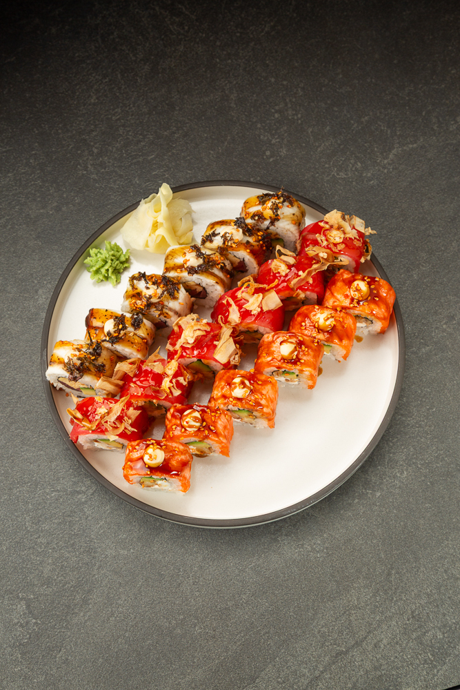 Трио из роллов: «Криспи Креветка», «Филадельфия» и «Запеченный с лососем и гребешком». Сочетает классику и пикантные нотки. Подается с васаби и маринованным имбирем