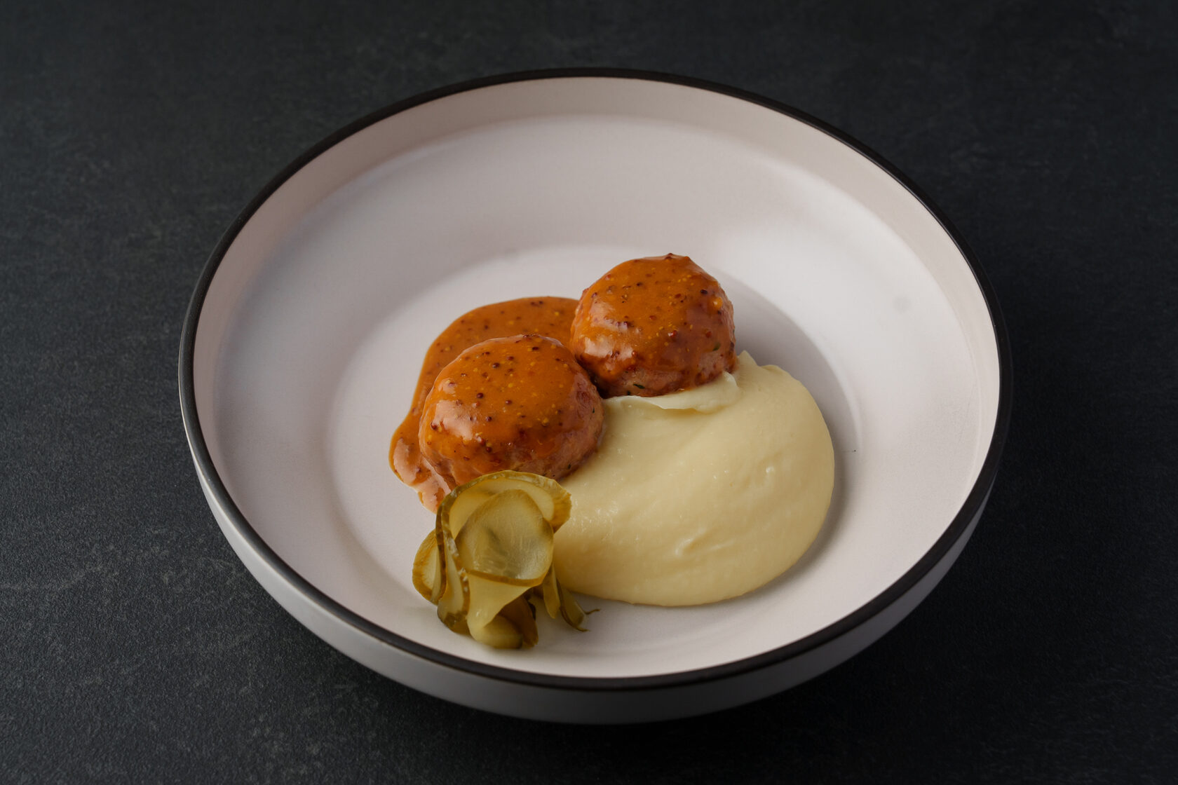 Нежные куриные котлетки с белыми грибами в пикантном перечном соусе. Подаются с кремовым картофельным пюре и хрустящими маринованными огурцами