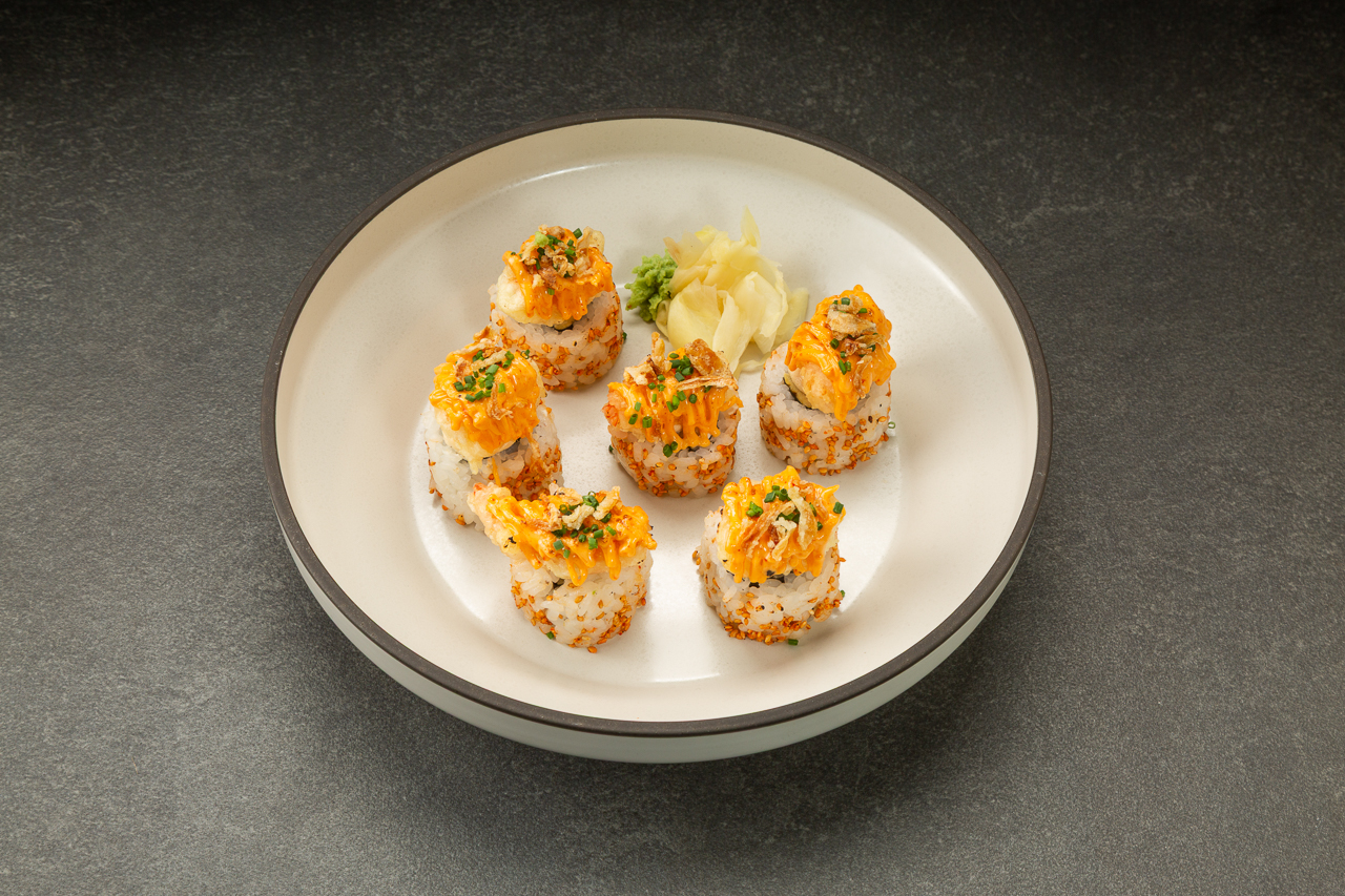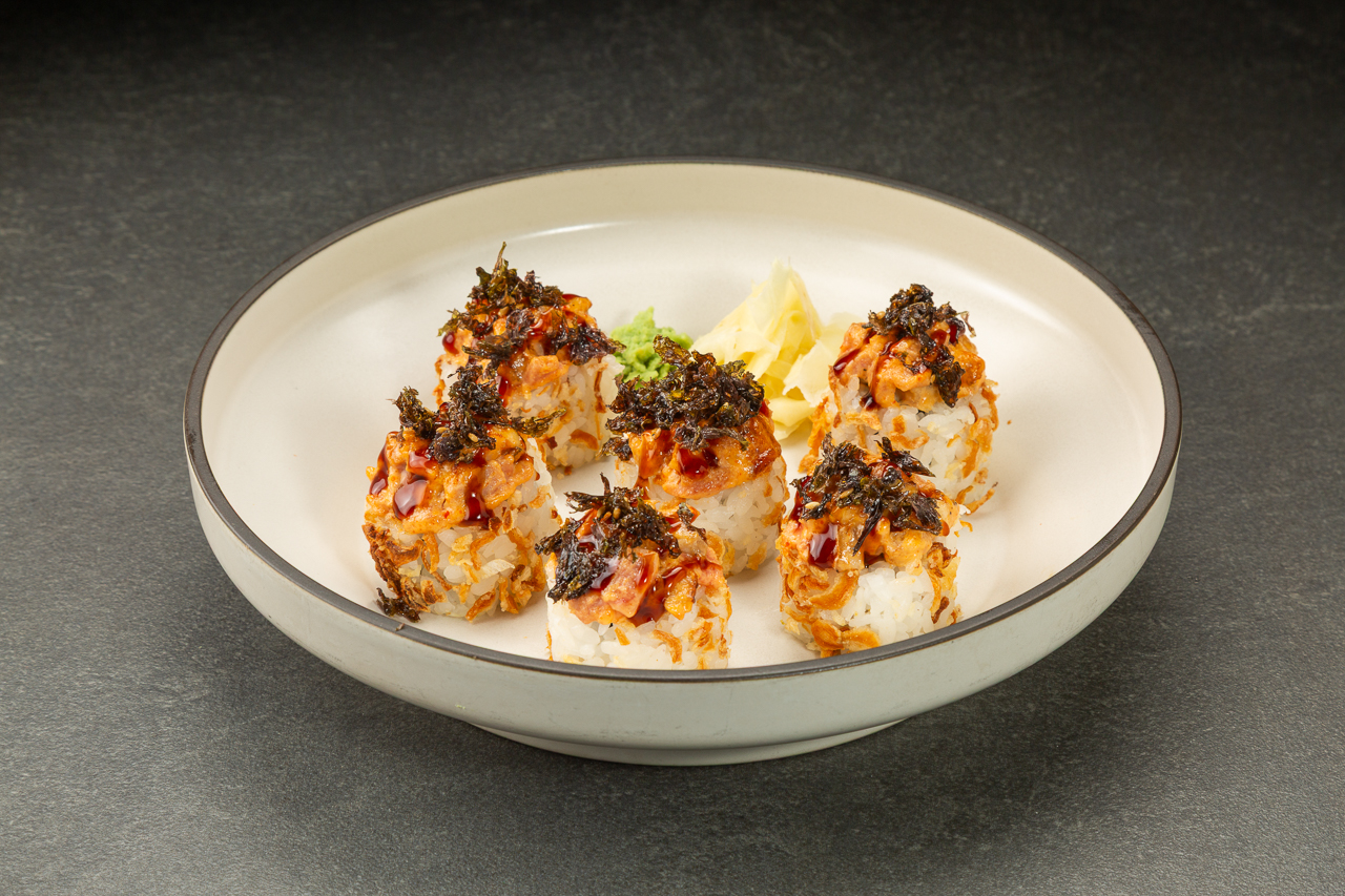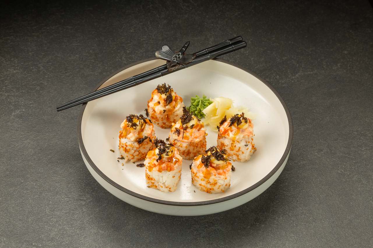 Нежный лосось и сладковатый морской гребешок под аппетитной золотистой шапочкой, слегка карамелизированной в печи. Тёплый рис, пропитанный соусом, и лёгкая дымность запекания делают каждый кусочек сочным, насыщенным и по-настоящему роскошным.