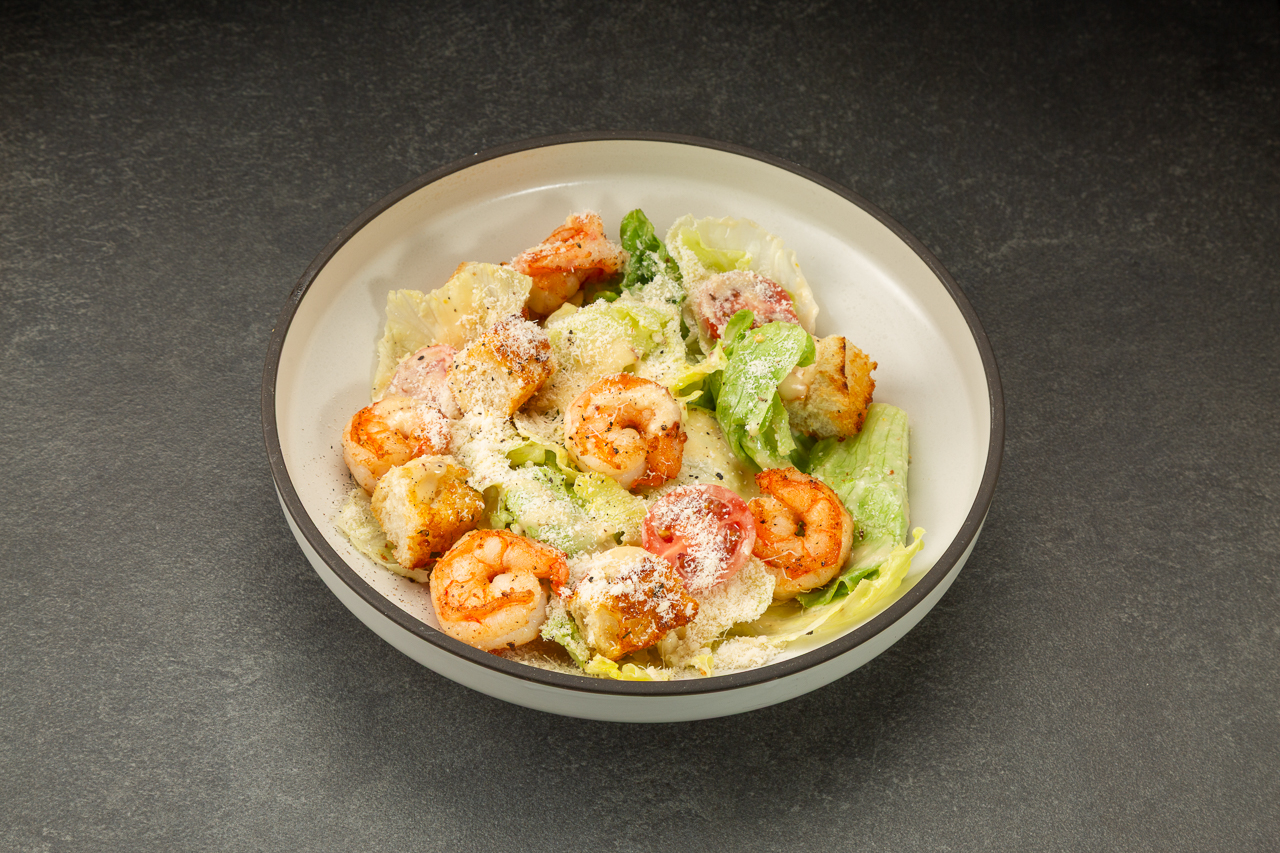 Классический салат с айсбергом и тигровыми креветками, щедро заправленный соусом цезарь собственного приготовления. Сочные томаты и пармезан завершают блюдо гармонией вкусов