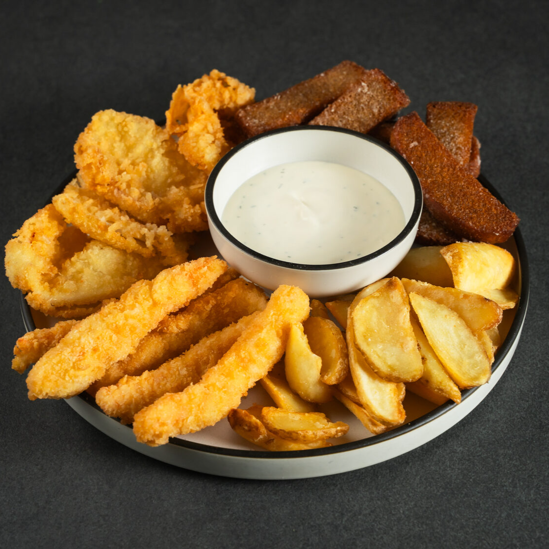 Хрустящая закуска для компании: креветки и кальмар темпура, картофель айдахо, гренки из черного хлеба и сметанно-чесночный соус