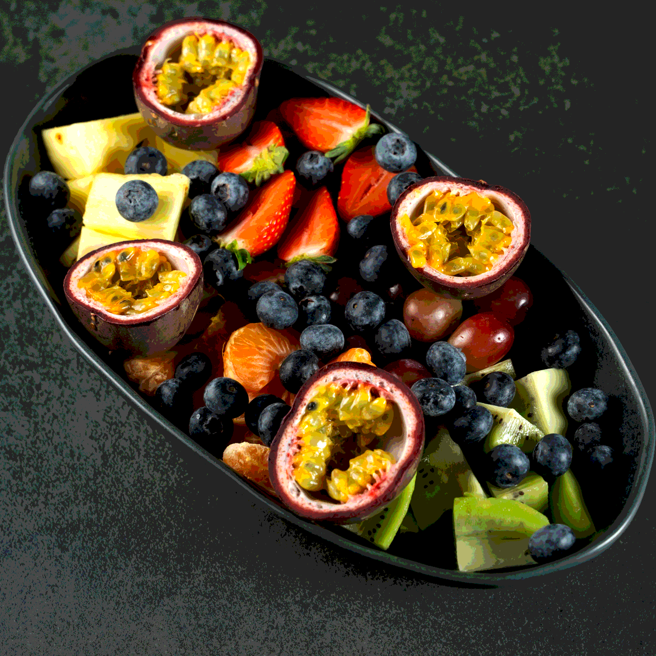 Только самые спелые и сочные фрукты: клубника, мандарины, ананас, киви, голубика, виноград, маракуйя