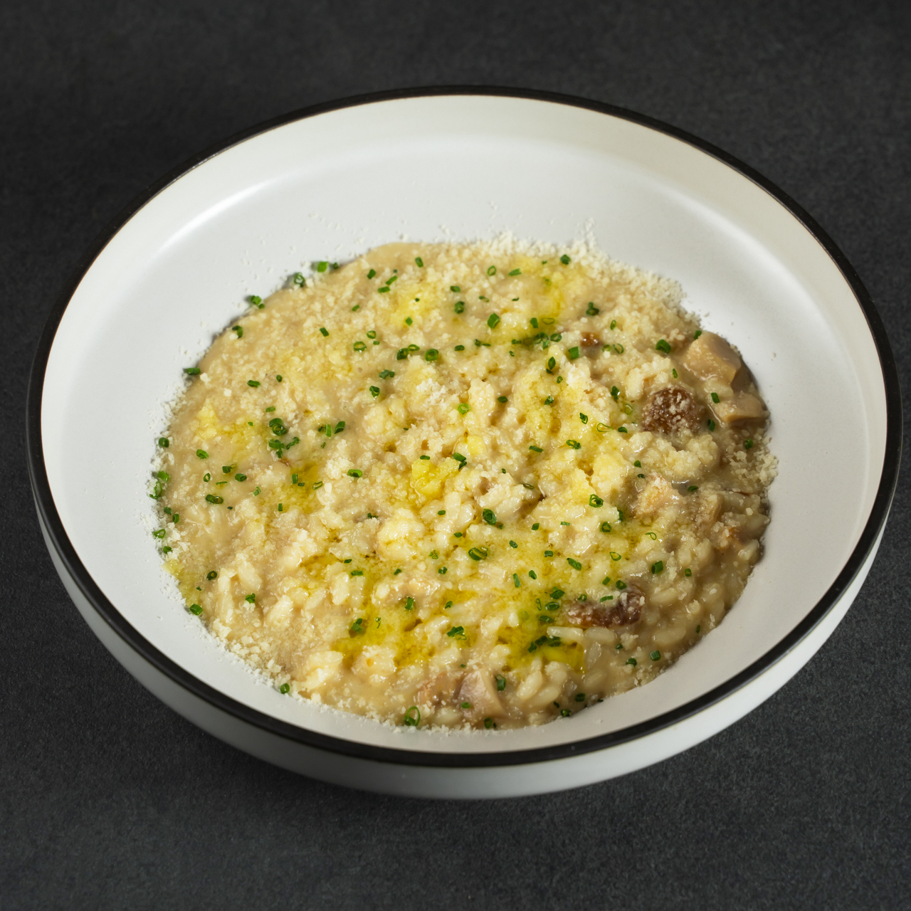 Классическое ризотто из риса арборио с белыми грибами, томлёное до кремовой текстуры. Завершено пармезаном, сливочным маслом и ароматной петрушкой