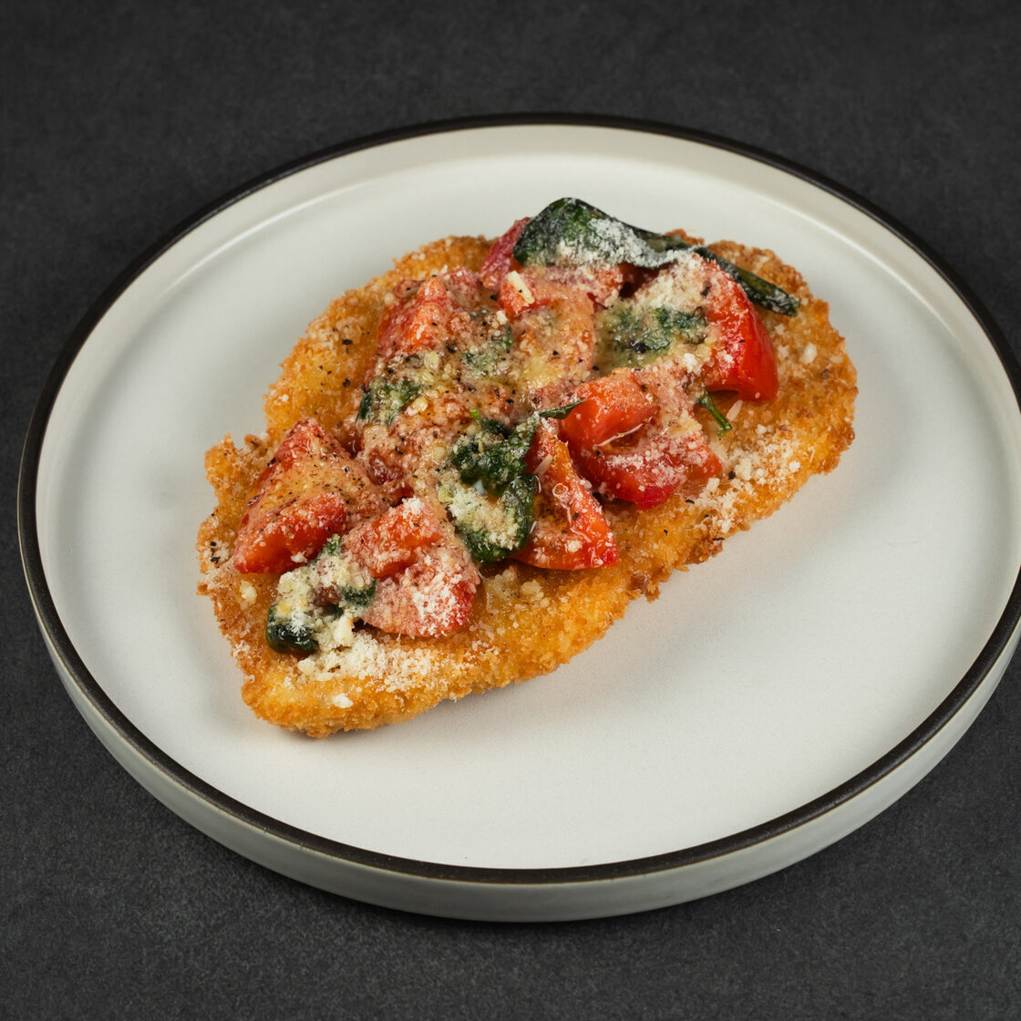 Хрустящая куриная грудка в золотистой панировке, дополненная свежими тёплыми томатами. Сливочное масло, базилик и пармезан делают вкус особенно нежным и гармоничным. Отличный выбор для ценителей сытных и сочных блюд