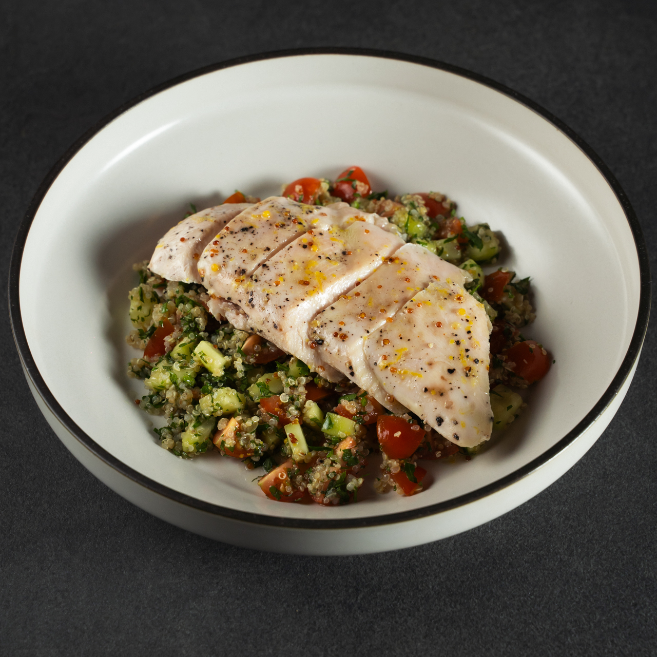 Изысканная закуска, которая порадует вас свежестью и нежным вкусом, — это табуле с тёплым цыплёнком. В ней гармонично сочетаются лёгкая паровая грудка цыплёнка, хрустящие свежие огурцы и томаты черри, питательная отварная киноа и ароматная лимонная заправка с мёдом. Украшенная свежей мятой, петрушкой и зелёным луком, а также с лёгкой ноткой каперсов, эта закуска станет отличным началом вашего обеда или ужина