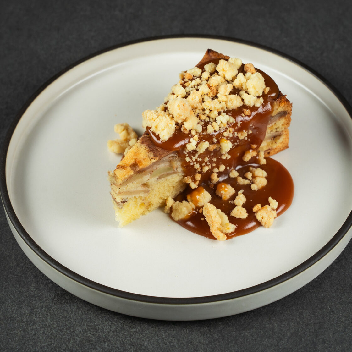 Воздушная шарлотка с ароматными яблоками и корицей, под золотистой корочкой. Украшена миндальным крамблом и политая сливочной солёной карамелью. Сочетание сладости и лёгкой солоноватой нотки делает десерт по-настоящему изысканным.