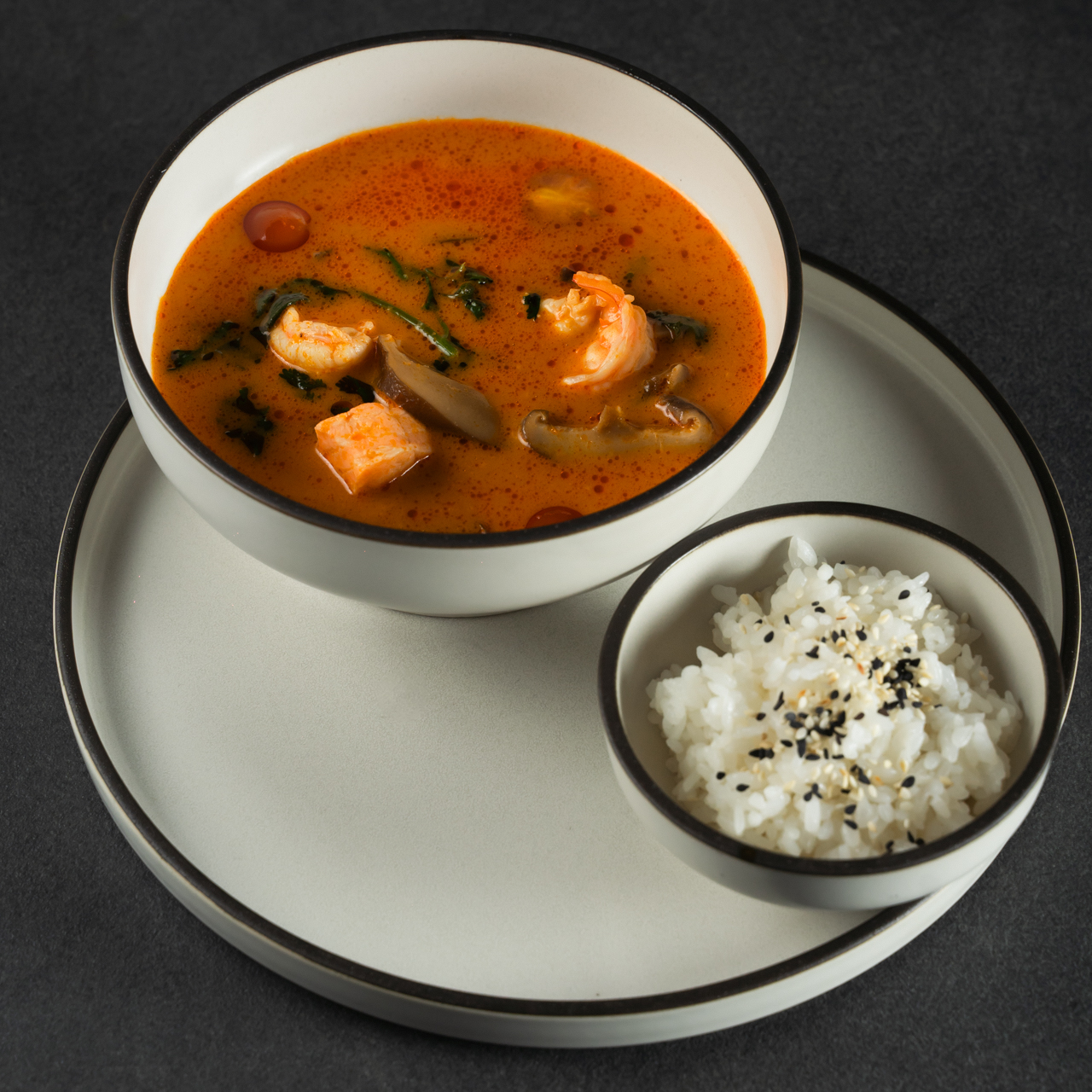 Пряный и яркий суп том ям с тигровыми креветками и кальмарами в кокосовом бульоне с имбирём, лаймом и лимонной травой. Черри и шиитаке добавляют глубину вкуса, а отварной рис и свежая кинза делают блюдо по-настоящему гармоничным